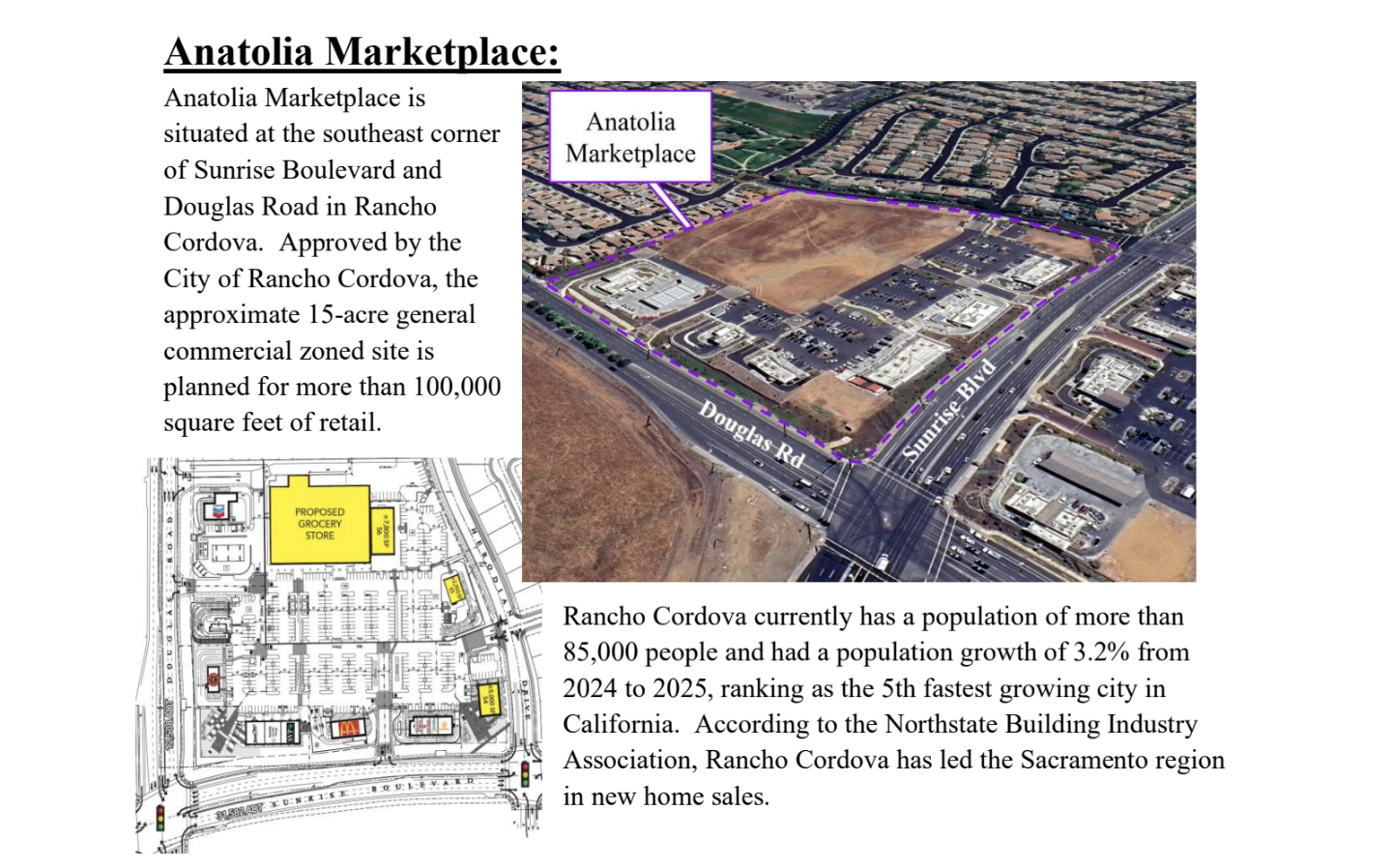 Anatolia Marketplace offers prime development land parcels at Sunrise Blvd & Douglas Rd in Rancho Cordova. This high-traffic shopping center features anchor, pad, QSR and shop spaces available with established tenants McDonald's, Popeye's, Dutch Bros Coffee, Chipotle, and Chevron generating proven foot traffic.