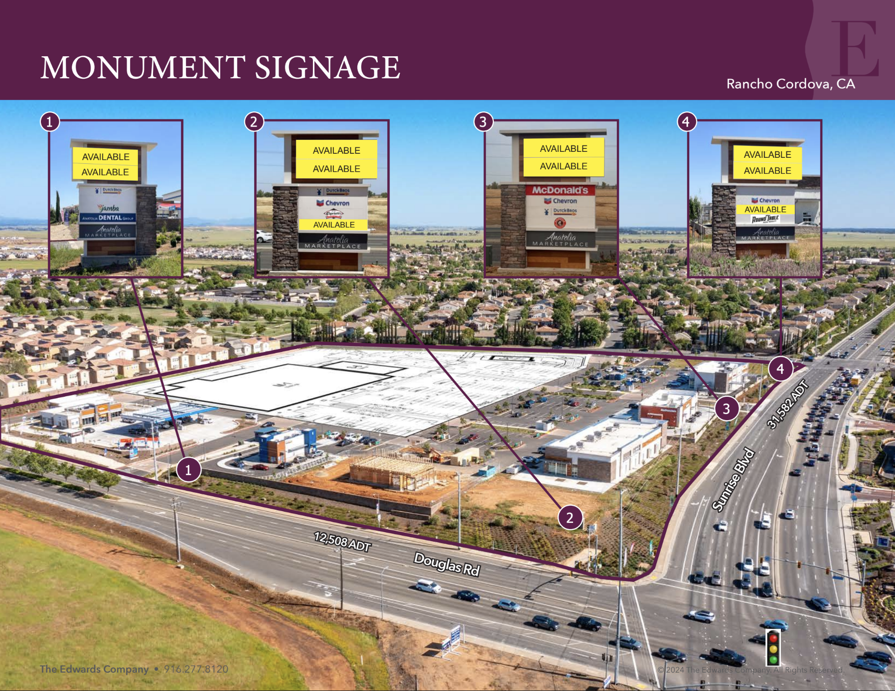 Anatolia Marketplace offers prime development land parcels at Sunrise Blvd & Douglas Rd in Rancho Cordova. This high-traffic shopping center features anchor, pad, QSR and shop spaces available with established tenants McDonald's, Popeye's, Dutch Bros Coffee, Chipotle, and Chevron generating proven foot traffic.