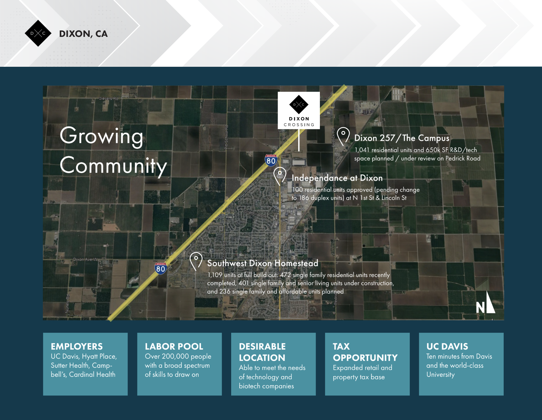 Dixon Crossing provides developers below market permits and fees, no bonds, business-friendly government, ability to build up to 1,020,000 SF, and a streamlined development process.