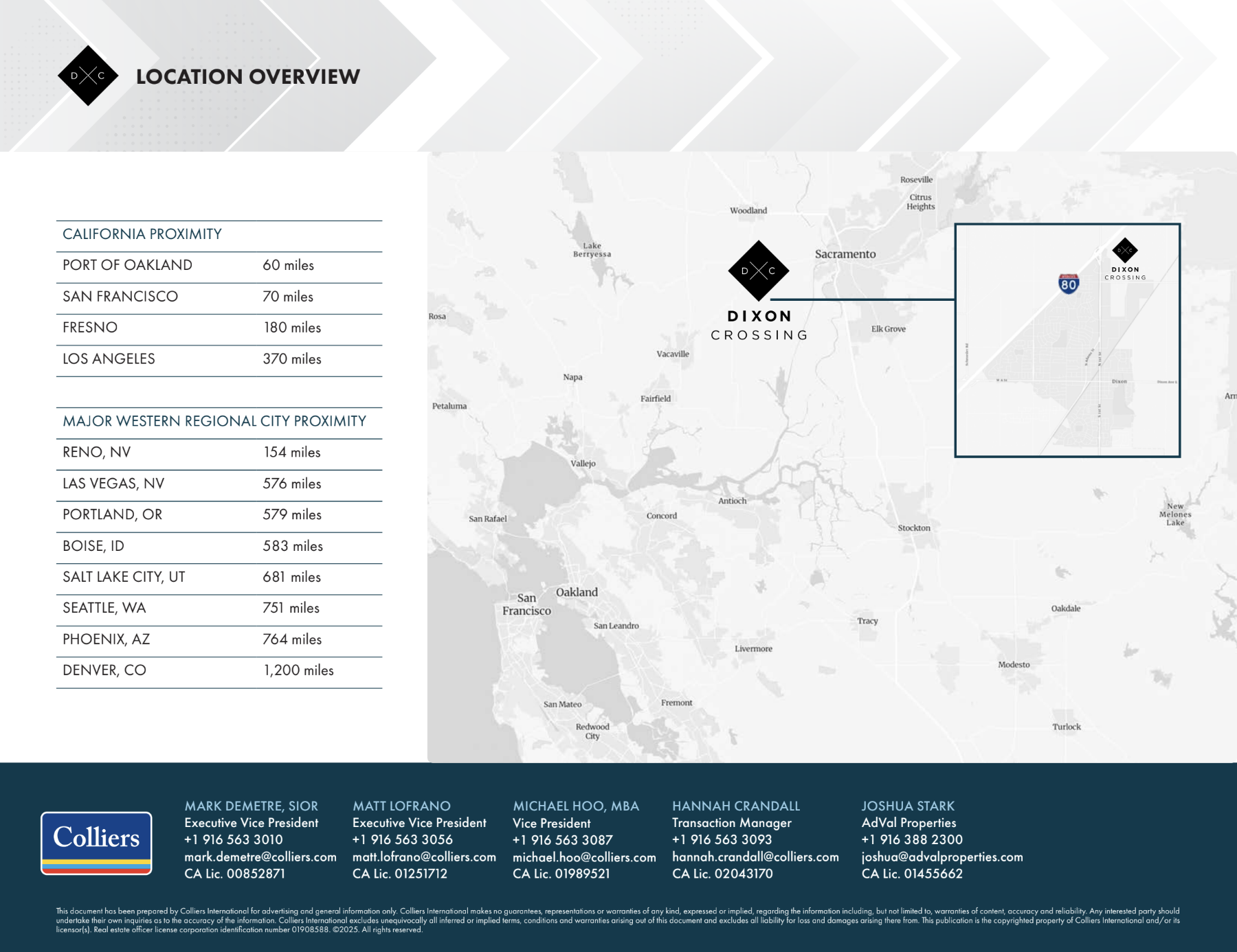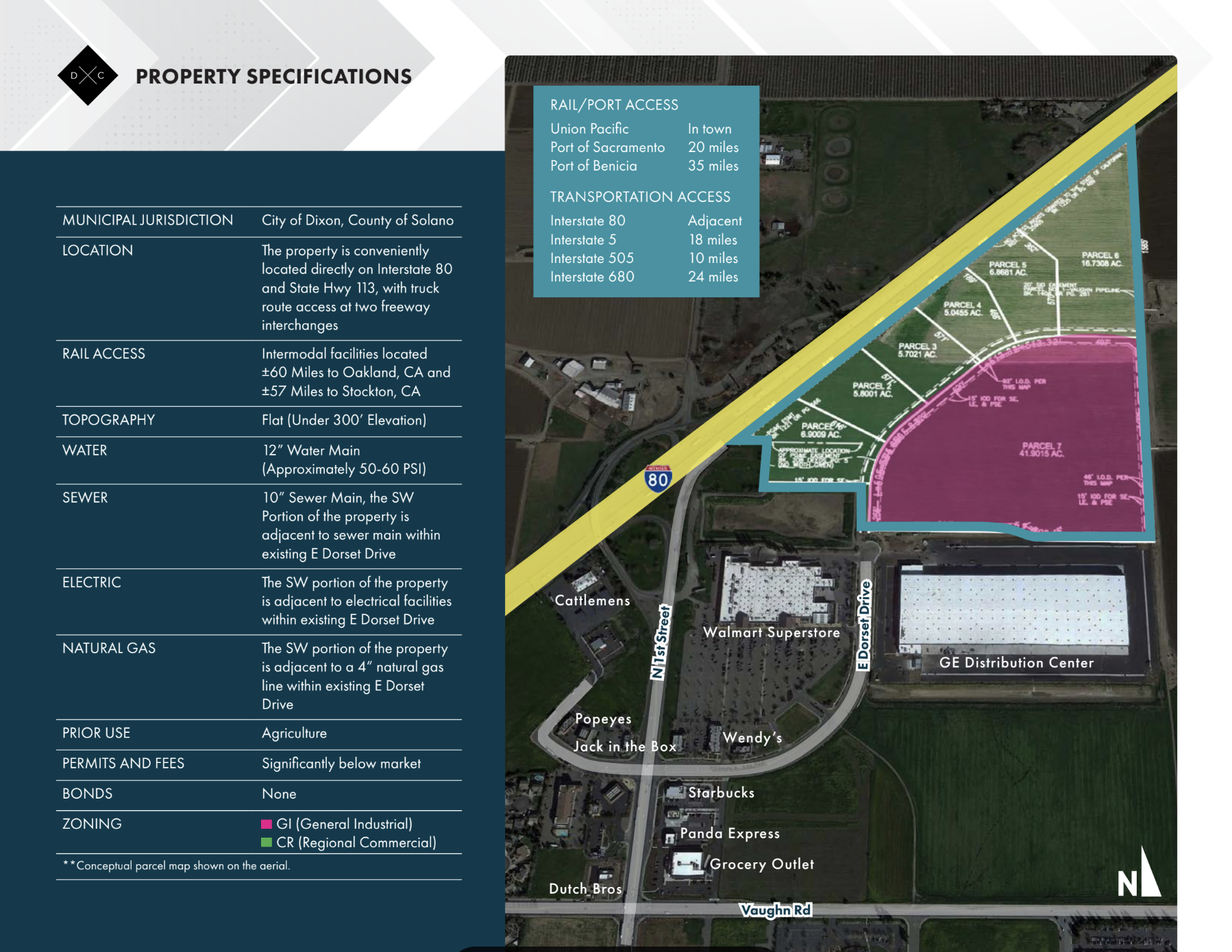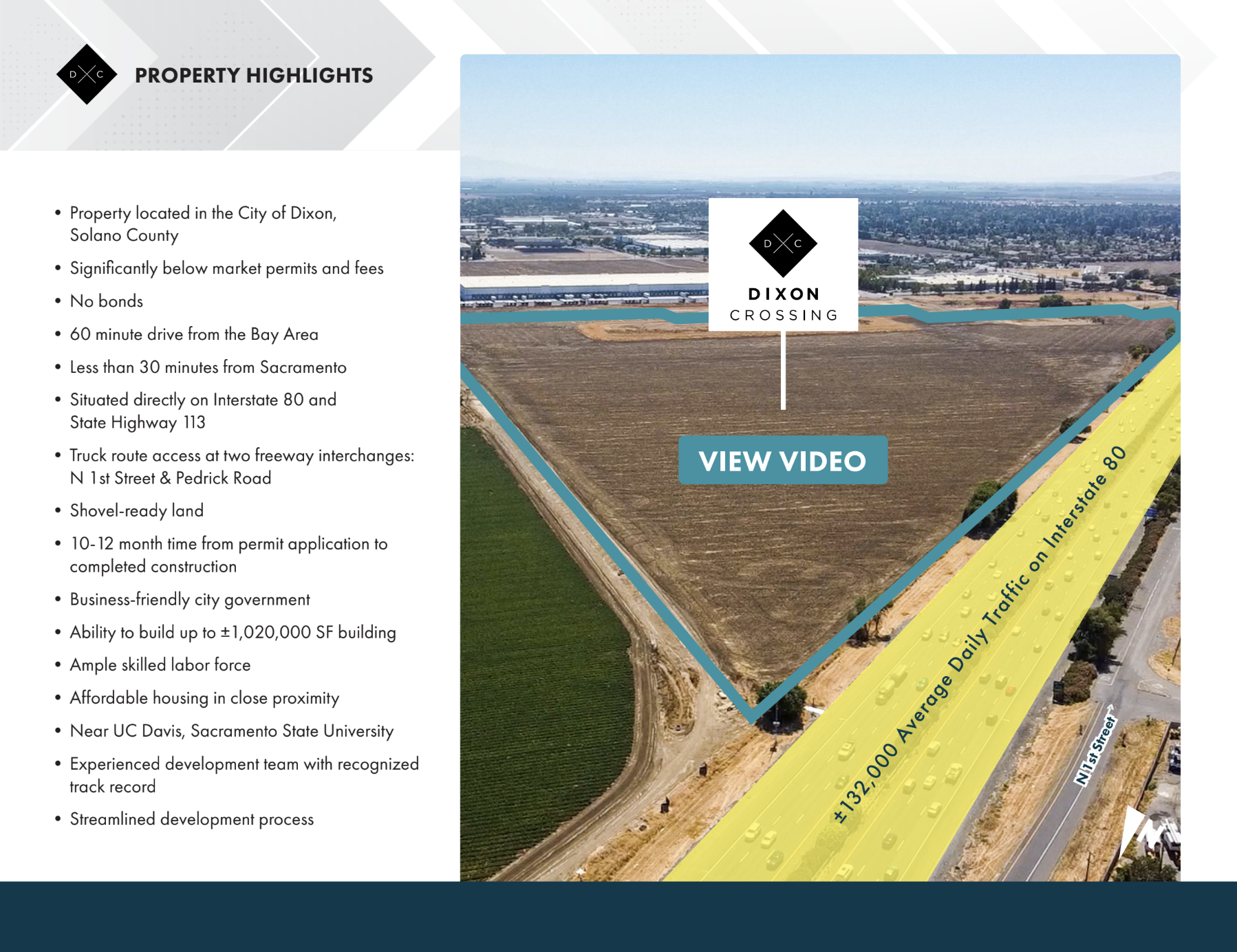 Dixon Crossing is an 82.75-acre commercial and industrial development opportunity on E. Dorset Drive in Dixon, CA, directly on Interstate 80. Purchase in all or part. With convenient access less than 30 minutes from Sacramento and 60 minutes from the Bay Area, this shovel-ready land offers truck route access at two freeway interchanges and proximity to skilled labor.