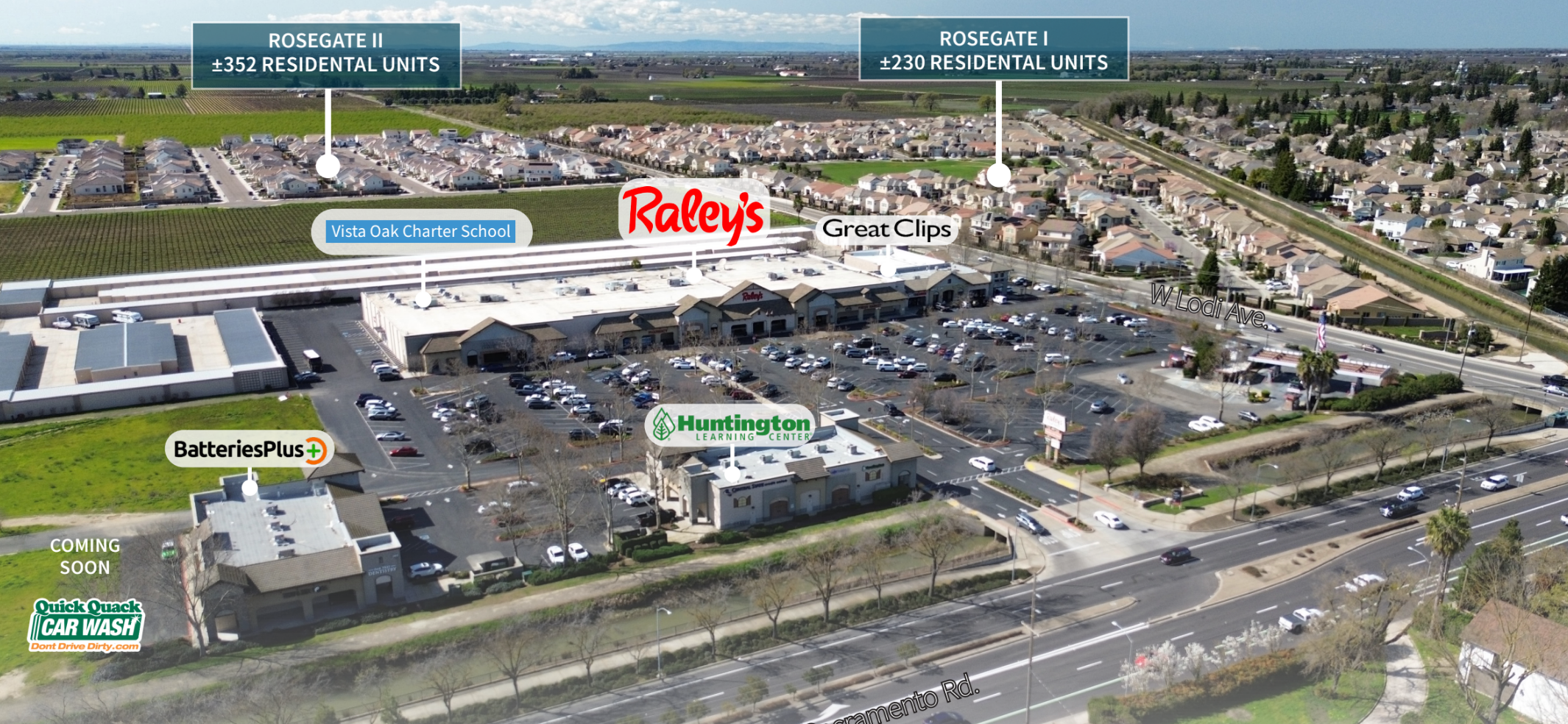 This Lodi commercial real estate benefits from substantial growth with 3,900+ residential units planned within 7 years. Prime signalized intersection location provides high visibility retail space access to affluent demographics with $100,351 average household income.